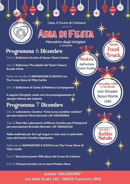 Anche quest’anno presso gli ampi locali del Salsedine Spazio Eventi l’Associazione Il Cuore di Cristiano organizza una grande Festa Natalizia con tante iniziative e un bellissimo Mercatino degli Artigiani. “Aria di Festa”, questo il nome dell’evento che vedrà la partecipazione di circa una settantina di espositori, tra artigiani e altre associazioni che lavorano nel sociale e nel territorio, oltre al Cuore di Cristiano Odv-Ets, ci saranno Colibrì, Laborastoria, Africa Sottosopra, Elvis e Cuore a Cuore, con banchi di artigiani che creano oggetti e idee regalo con i materiali più disparati.