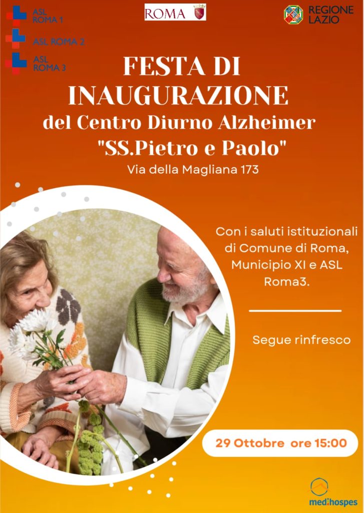 Si terrà mercoledì 29 ottobre, alle 15 in via della Magliana 173 a Roma, la Festa di inaugurazione del terzo Centro Diurno Alzheimer “SS Pietro e Paolo” della Asl Roma 3. La struttura è parte integrante del Polo Alzheimer costituito dal Roma Capitale che gestisce in integrazione con le aziende sanitarie capitoline 16 centri diurni, suddivisi in gestione dipartimentale e municipale e sempre in collaborazione con l’azienda sanitaria di appartenenza.