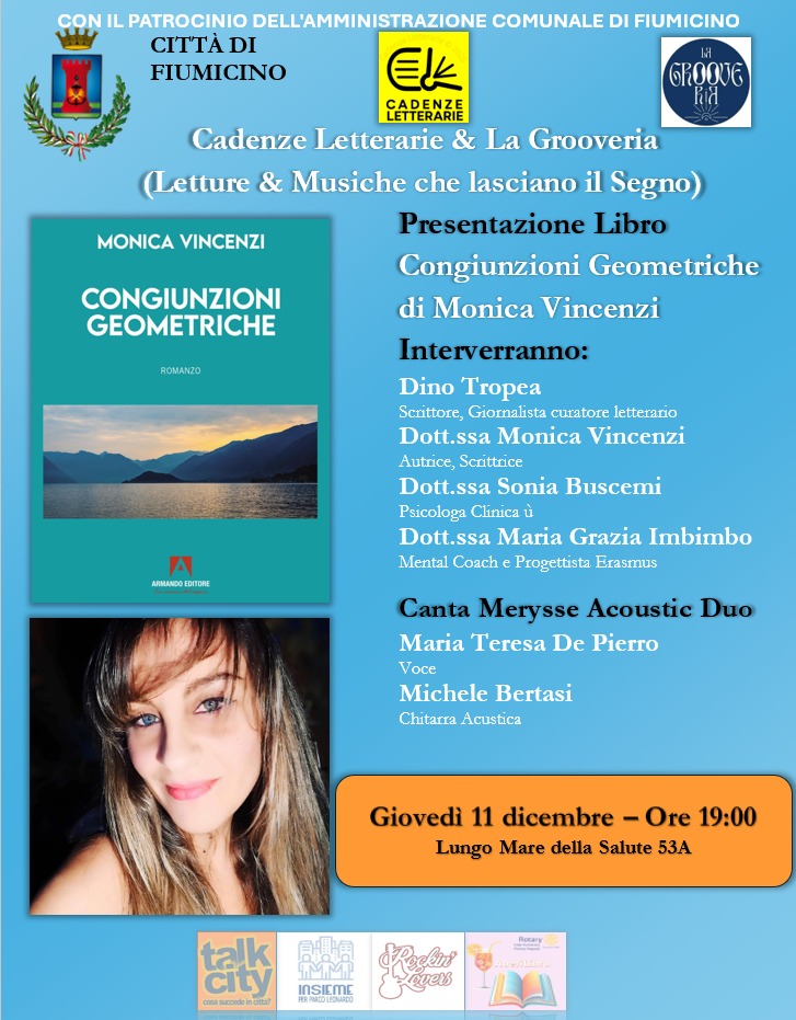 Nel corso dell’incontro sarà protagonista la scrittrice Monica Vincenzi, con la presentazione del suo libro “Congiunzioni Geometriche”, un’opera che esplora relazioni, forme e connessioni attraverso una voce narrativa originale e intensa. Ad arricchire la serata contribuirà inoltre l’esibizione musicale del duo Merysse – Acoustic Duo.