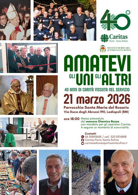 La diocesi di Porto-Santa Rufina celebra il 40° anniversario della Caritas diocesana, un traguardo che rappresenta quattro decenni di servizio, ascolto e vicinanza ai più fragili. Per l’occasione, sabato 21 marzo 2026, alle ore 18, nella parrocchia di Santa Maria del Rosario a Ladispoli, il vescovo Gianrico Ruzza presiederà una Messa di ringraziamento aperta a tutta la comunità. Nella celebrazione il presule conferirà il mandato agli operatori della carità.