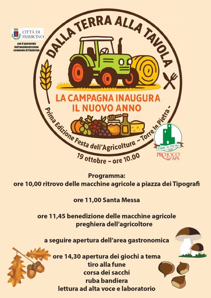 Il 19 ottobre, dalle 10 alle 15, si terrà la prima edizione della Festa dell’Agricoltura “Dalla Terra alla Tavola”, un evento patrocinato dal Comune di Fiumicino e organizzato dalla Pro Loco Torre in Pietra APS. La manifestazione avrà luogo presso i giardini della Chiesa di Sant’Antonio Abate, in via Francesco Marcolini 22.