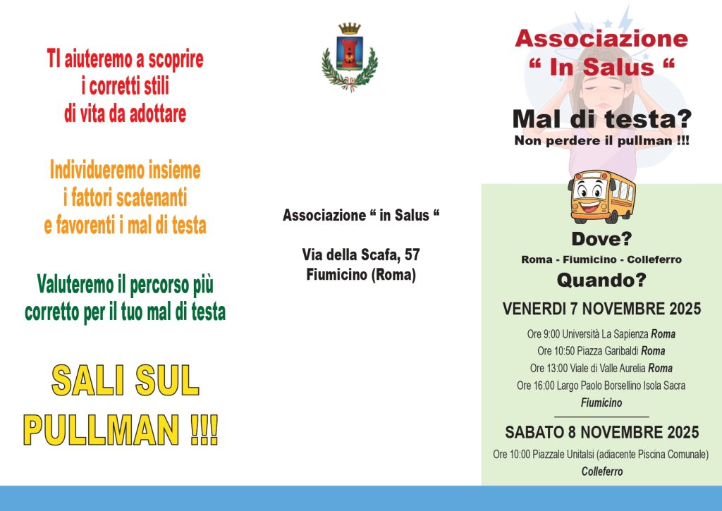 Il Comune di Fiumicino patrocina la campagna di sensibilizzazione promossa dall’Associazione “In Salus”, dal titolo “Mal di testa? Non perdere il pullman per la diagnosi e la cura delle cefalee”.