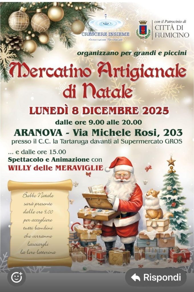 L’8 dicembre, dalle 9.00 alle 20.00, presso il Centro Commerciale La Tartaruga ad Aranova, l’Associazione Territoriale Crescere Insieme organizza il Mercatino Artigianale di Natale, un appuntamento dedicato alla creatività locale e alle tradizioni del periodo natalizio, patrocinato dal Comune di Fiumicino.