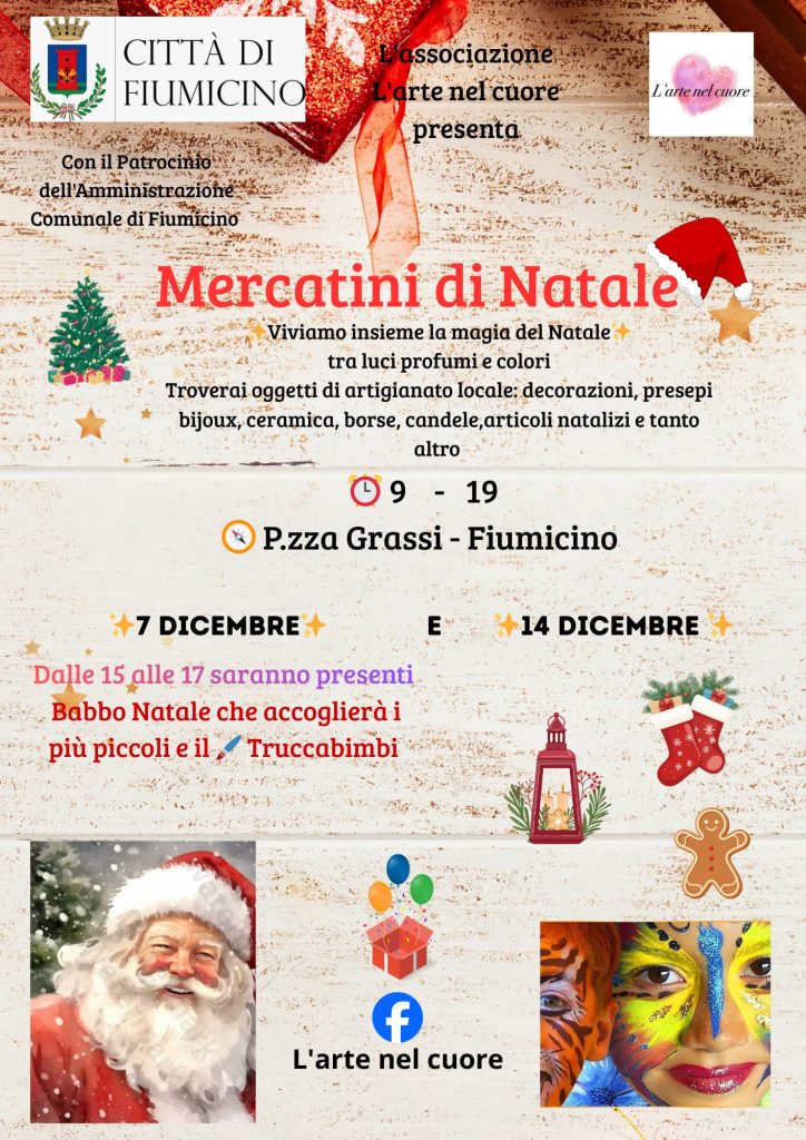 L’Associazione Arte nel Cuore, con il patrocinio del Comune di Fiumicino, presenta il “Mercatino Natalizio 2025”, una settimana dedicata alla magia delle festività, tra artigianato, colori e atmosfere tradizionali. L’iniziativa sarà attiva ogni giorno dalle 9.00 alle 19.00 in piazza Grassi a Fiumicino dal 7 al 14 dicembre.