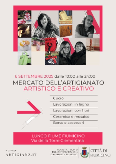 Lavorazioni artistiche su legno e cuoio, gioielli artigianali e mosaici artistici, vasi e lampade realizzati con materiali di recupero: sono solo alcuni esempi delle lavorazioni che saranno esposte presso il centro storico di Fiumicino, sabato 6 settembre per il primo dei mercati artistici. L’evento, patrocinato dal Comune di Fiumicino, si svolgerà in Via Torre Clementina a partire dalle 10.00 fino alle 24, con tredici stand che ospiteranno oggetti artigianali.