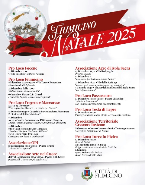 Dalle attività per i più piccoli ai laboratori creativi, dalle iniziative culturali agli spettacoli dal vivo, il calendario del Natale 2025 offre tante opportunità per vivere insieme momenti di condivisione. La collaborazione tra le associazioni locali e le istituzioni ha reso possibile creare un programma variegato che valorizza ila Città di Fiumicino e le sue eccellenze.