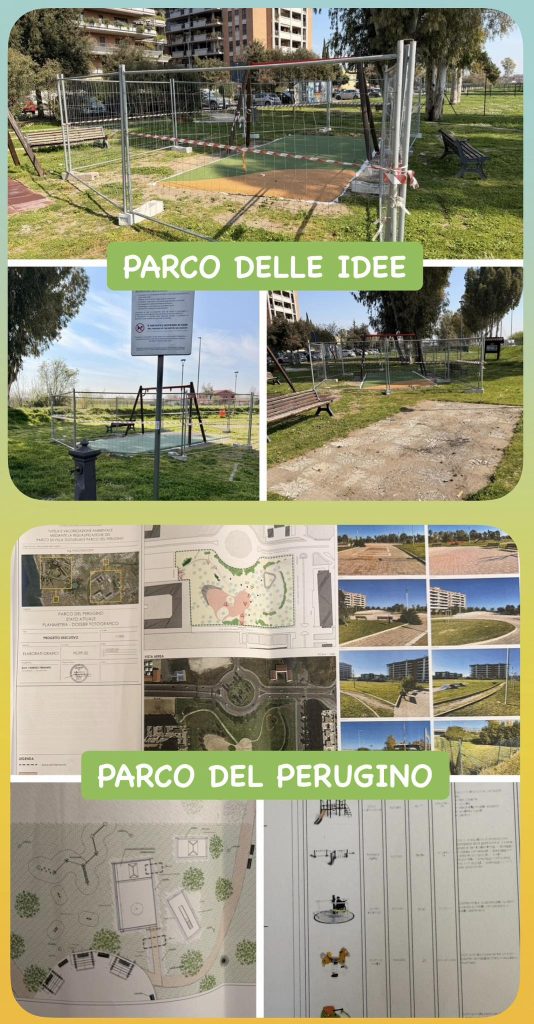 Per il Parco delle Idee i lavori sono iniziati. È prevista la rimozione dei giochi pericolanti, la sostituzione della pavimentazione antitrauma, un nuovo scivolo e l’installazione di una nuova palestrina, come richiesto dai nostri figli. Inoltre, si interverrà con una pulizia generale del parco, la potatura del verde, la sostituzione delle panchine e sono già stati effettuati sopralluoghi per il ripristino dell’impianto di irrigazione e la sistemazione della fontanella.