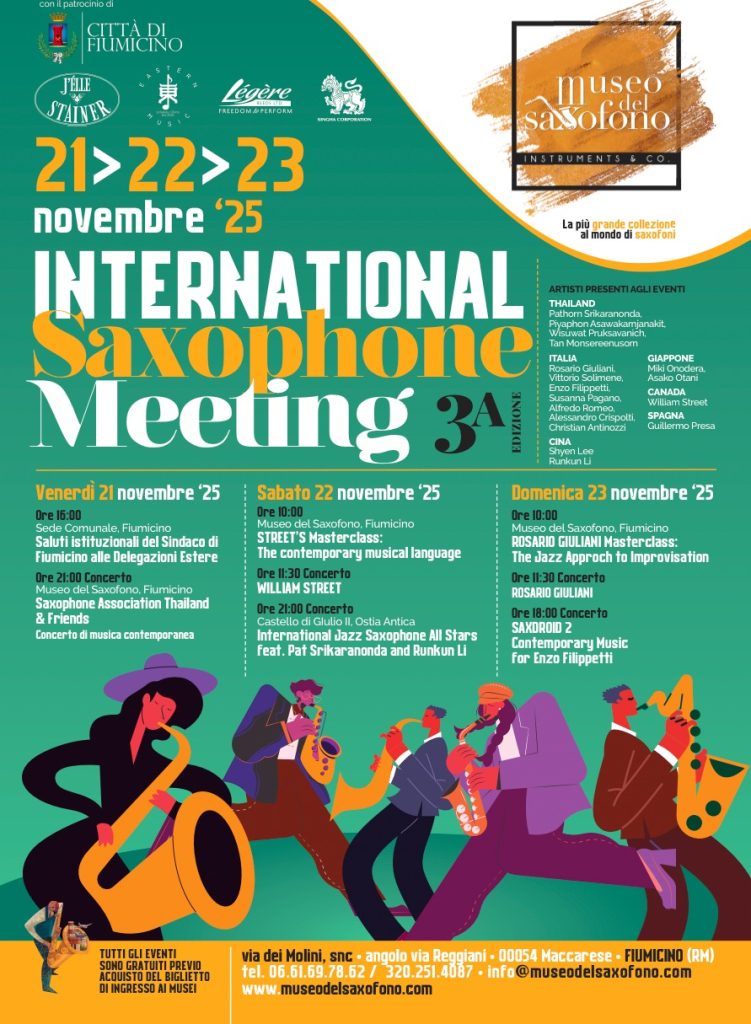 Dal 21 al 23 novembre il Museo del Saxofono di Fiumicino e il Castello di Giulio II a Ostia Antica, ospiteranno la 3ª Edizione dell’Internationale Saxophone Meeting, dedicata alla divulgazione del patrimonio museale e alla valorizzazione del saxofono come strumento artistico e culturale globale.